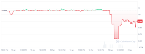 Como puede verse en la imagen a continuación, rsETH perdió la paridad con ether (ETH) y, hasta el momento, no logra recuperarla: