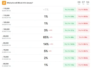 En este contexto, los mercados de predicción han captado una atención creciente. En Polymarket, los participantes asignan alrededor de un 65% de probabilidad a que Bitcoin toque los 85,000 dólares o menos antes de que finalice enero.