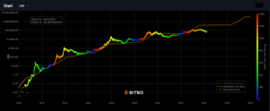El segundo modelo en cuestión es el Halving Price Regression (HPR), conocido popularmente como el «gráfico arcoíris».