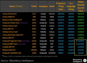 Por su parte, Eric Balchunas, colega de Seyffart en Bloomberg Intelligence, complementó la visión al señalar que las proyecciones de 100 lanzamientos de ETF de criptomonedas también abarcan productos estructurados bajo la Ley de Sociedades de Inversión de 1940 (Ley ’40).