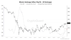 La métrica Bitcoin: Flujo de Intercambio, que rastrea la cantidad de Bitcoin que entra en las diez carteras de intercambio principales, también aparece en este análisis. Recientemente, grandes cantidades de Bitcoin han estado ingresando a los intercambios. Según el experto en cripto, esto sugiere que las ganancias realizadas van acompañadas de transferencias a los intercambios. Cuando un gran volumen de criptomoneda (en este caso, Bitcoin) se transfiere a un intercambio, suele ser una señal de presión de venta entrante. Esto ocurre porque los tokens transferidos a menudo se mueven con la intención de ser vendidos, debido a una mayor aversión al riesgo entre sus inversores, o como resultado de simplemente tomar ganancias.