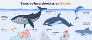 En el mercado de bitcoin, hay distintos tipos de inversores, siendo las grandes ballenas, ballenas, tiburones y delfines los más importantes, pues holdean más de 100 BTC. Otros más pequeños son los peces, pulpos, cangrejos y camarones, cuyas tenencias no llegan al centenar de bitcoin.