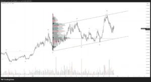 Trading View ordenada dentro de un canal ascendente bien definido. El precio respeta mínimos crecientes y reacciona de forma consistente en la zona media del canal, mientras el volumen acompaña los impulsos, validando la continuidad de la tendencia principal pese a las correcciones.